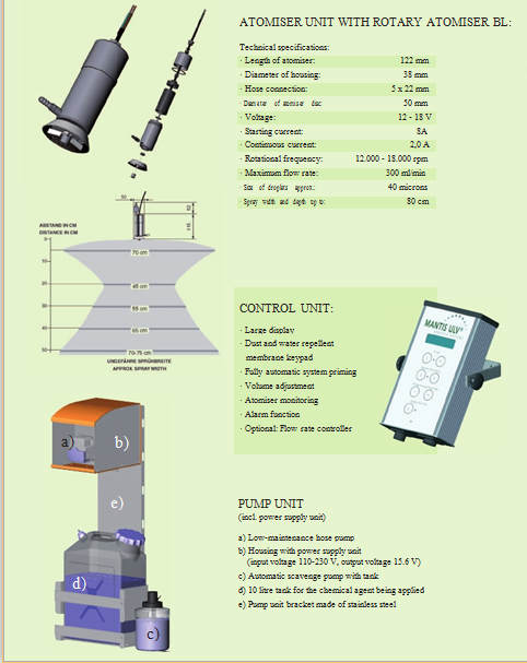 Automatic priming of the system, meaning a check of all functions and the conveyance of liquid to the atomiser(s) prior to the start of application, is made possible by a modern control unit. Desired volumes can be set directly on the control unit. During operation, atomiser function is monitored and an alarm function is triggered in the event of a malfunction. A flow rate controller is also available as an option.